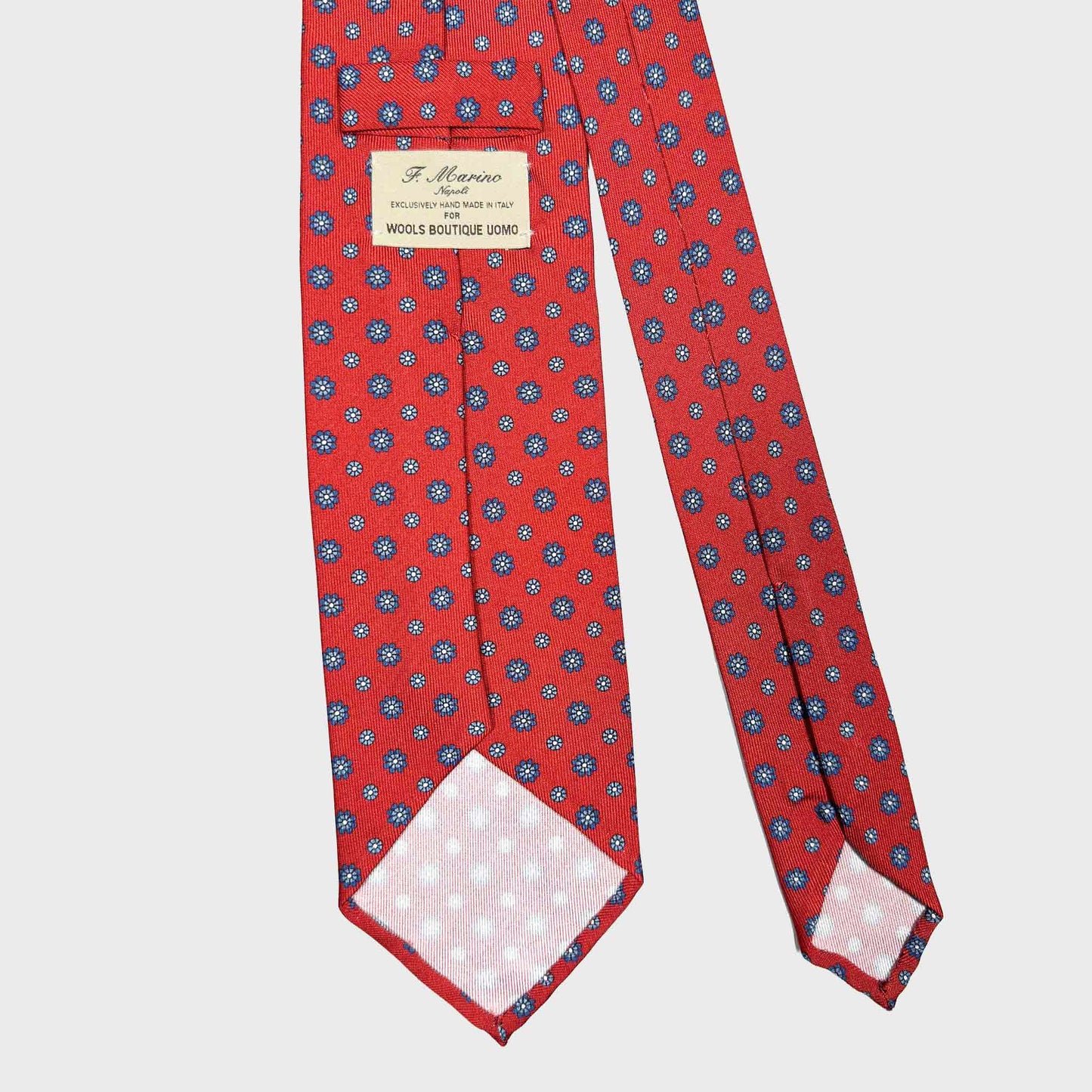 This silk tie presents a timeless interpretation of classic menswear, defined by a refined micro daisy pattern set on a rich ruby red background. The floral motif, rendered in light blue, denim tones and white, creates a balanced contrast that remains elegant and understated.