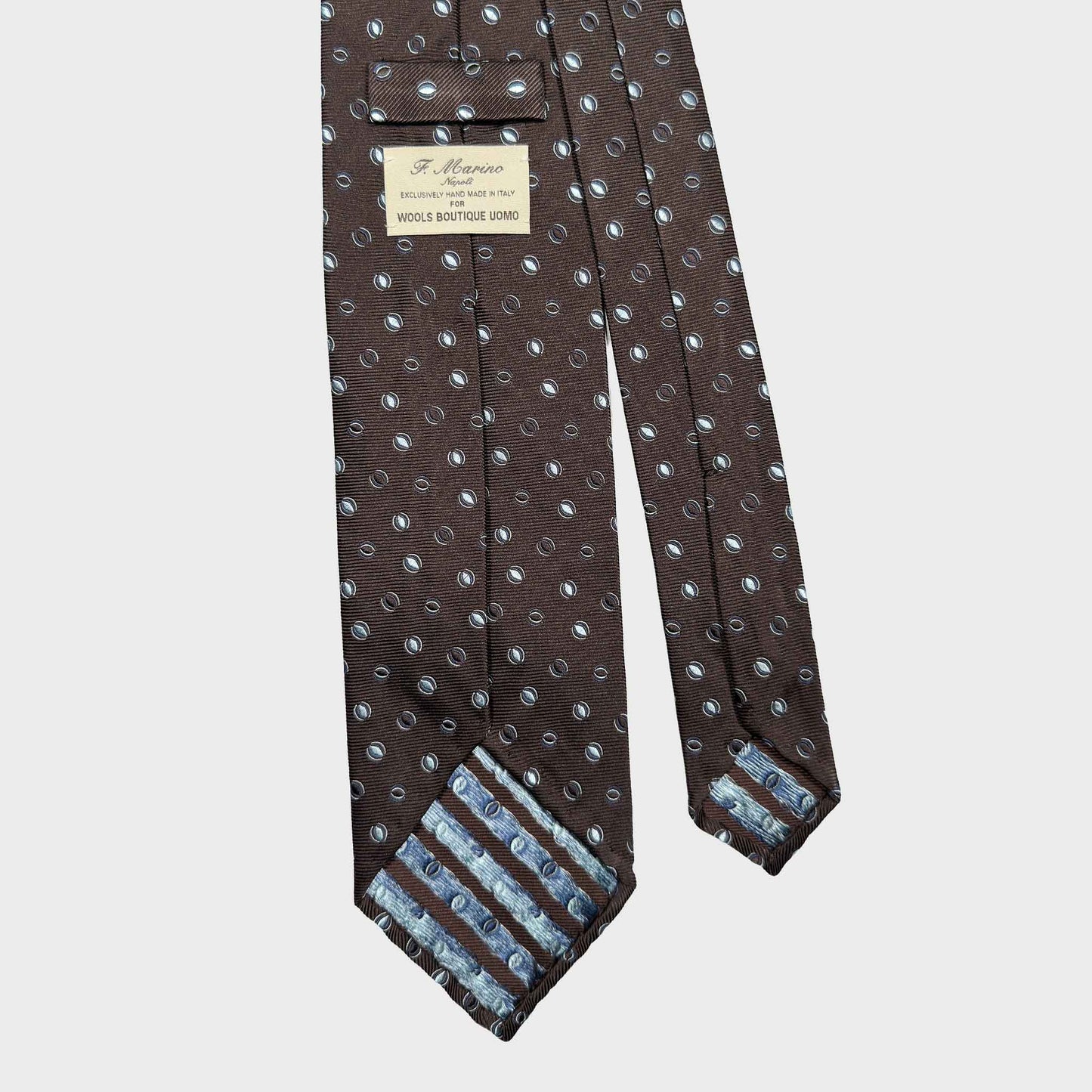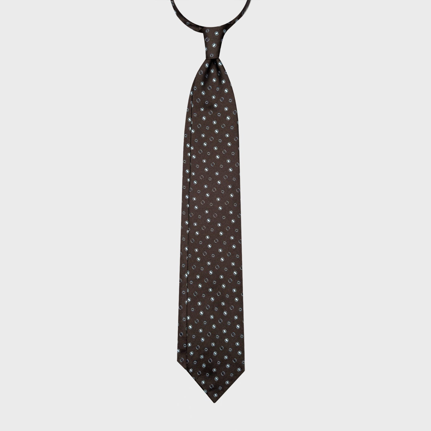 This silk tie features a refined micro oval pattern set on a rich coffee brown background. The subtle contrast of light blue motifs creates a balanced visual rhythm, adding depth without overwhelming the overall design.