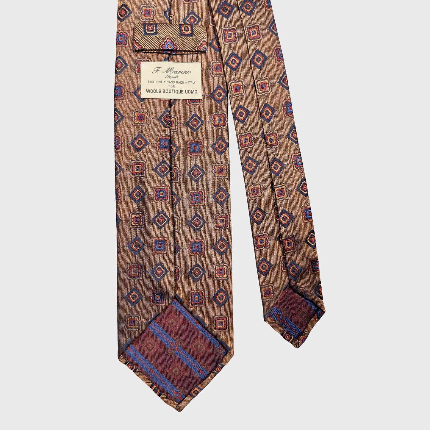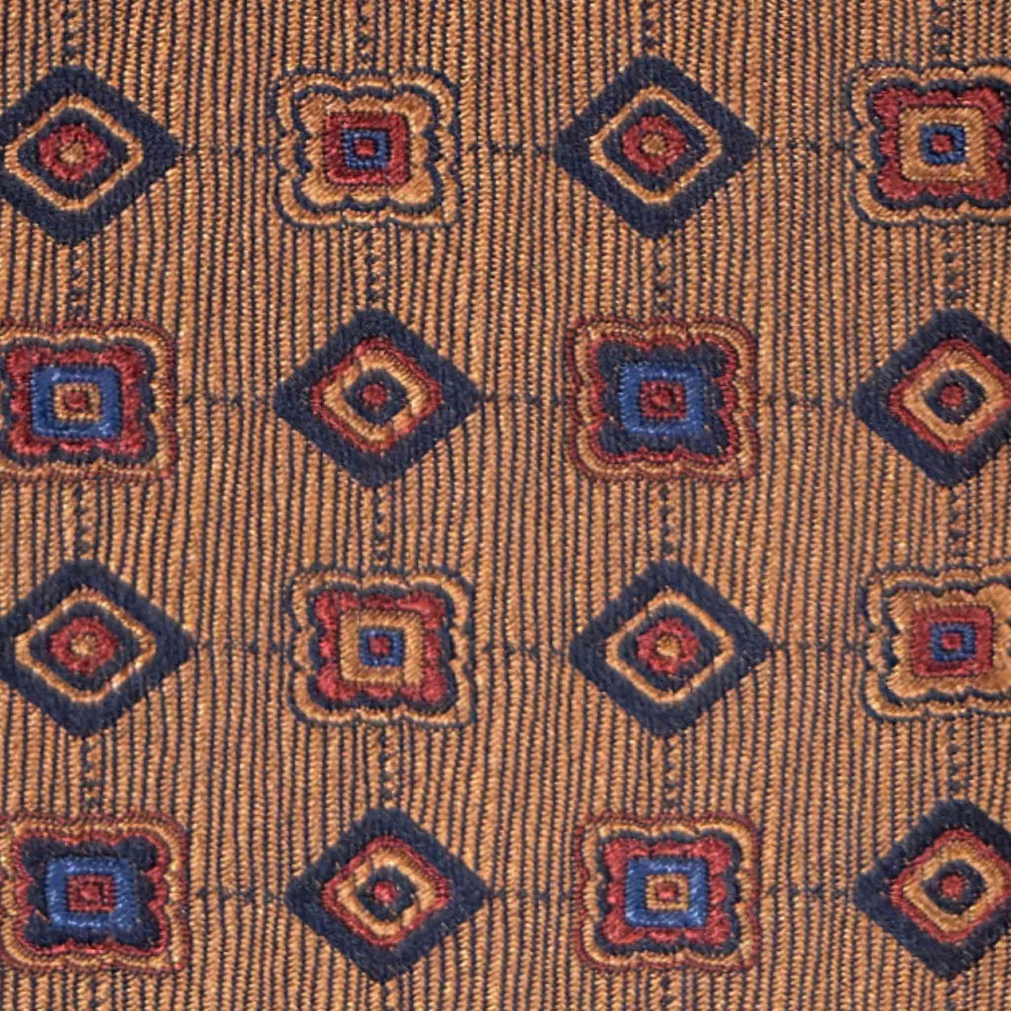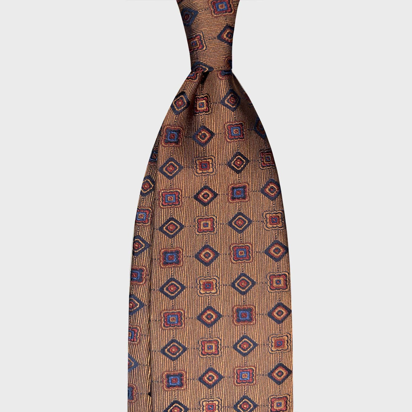 This silk tie features a distinctive copper brown background enriched by a subtle textured weave that enhances depth and character. The geometric diamond pattern, in shades of navy, sky blue and warm orange. The warm tone of the base makes it particularly versatile for contemporary tailoring, pairing naturally with navy blazers, brown jackets or beige tones. It offers a sophisticated alternative to more traditional colour palettes, especially for those looking to move beyond classic navy while maintaining a sartorial approach.