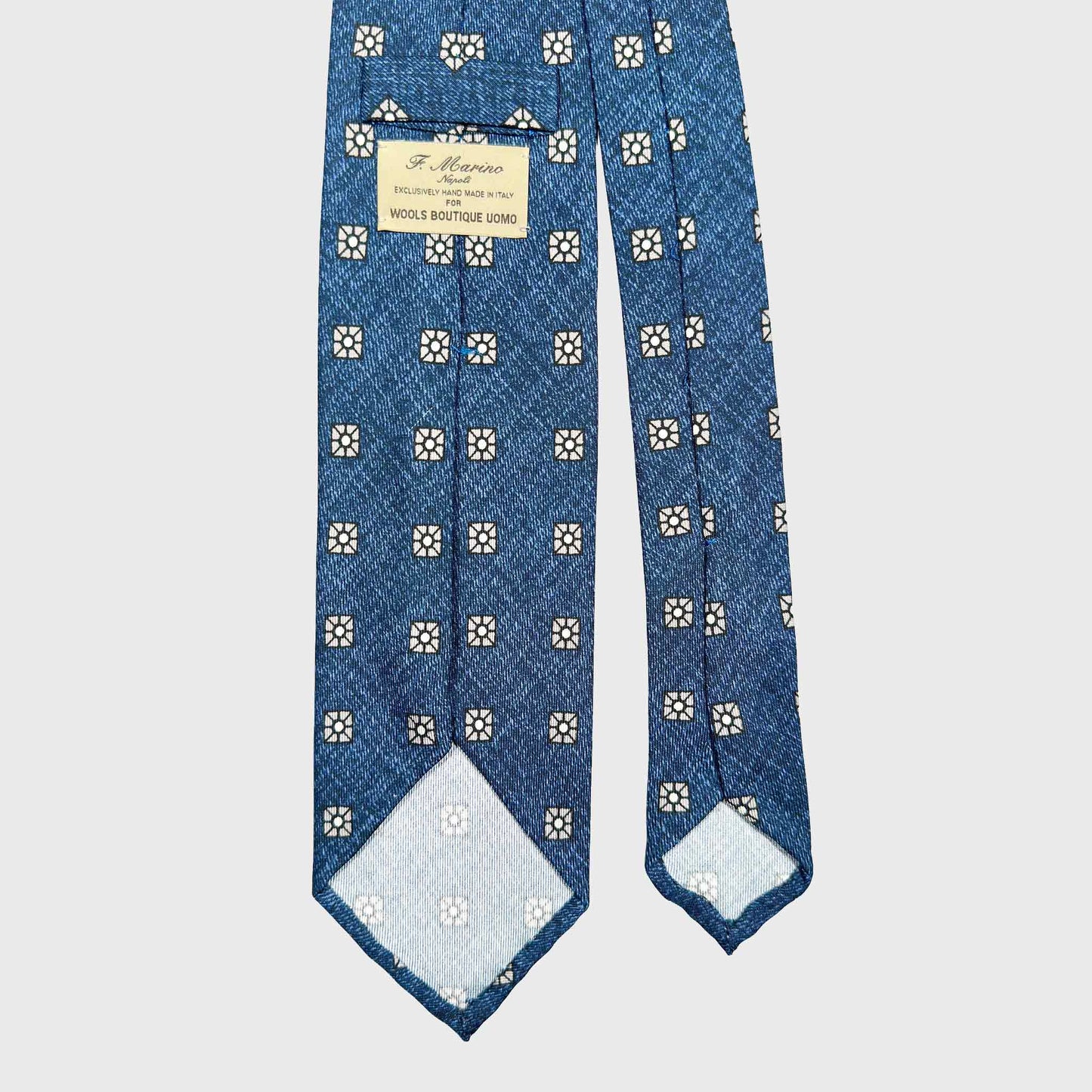 This silk tie stands out for its refined flamed texture in a luminous ocean blue tone, enriched by a subtle medallion pattern in light beige and ivory. Designed for four-season wear, it adapts effortlessly to formal business settings while offering a distinctive alternative to classic flat silks. It pairs naturally with navy or grey tailoring, but also elevates more relaxed combinations with textured blazers and contrasting trousers, embodying a modern approach to sprezzatura.