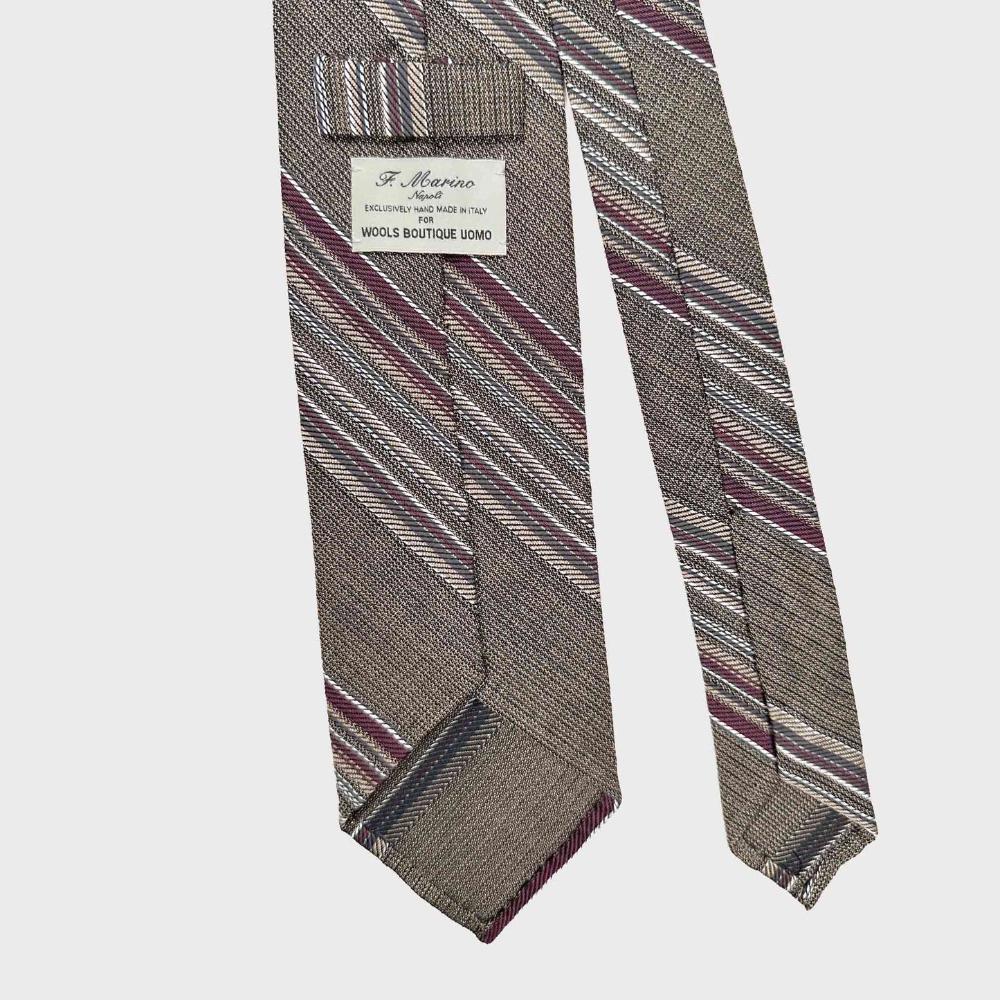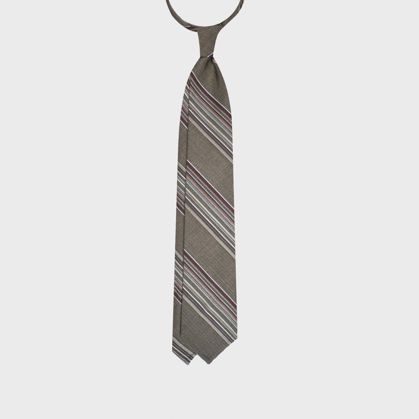 The background, in a natural sand brown tone, is enriched by a subtle textured weave that gives the surface a soft, almost tactile depth. Across it, a sequence of diagonal micro stripes unfolds in harmonious shades of burgundy, ivory, loden green, beige.
