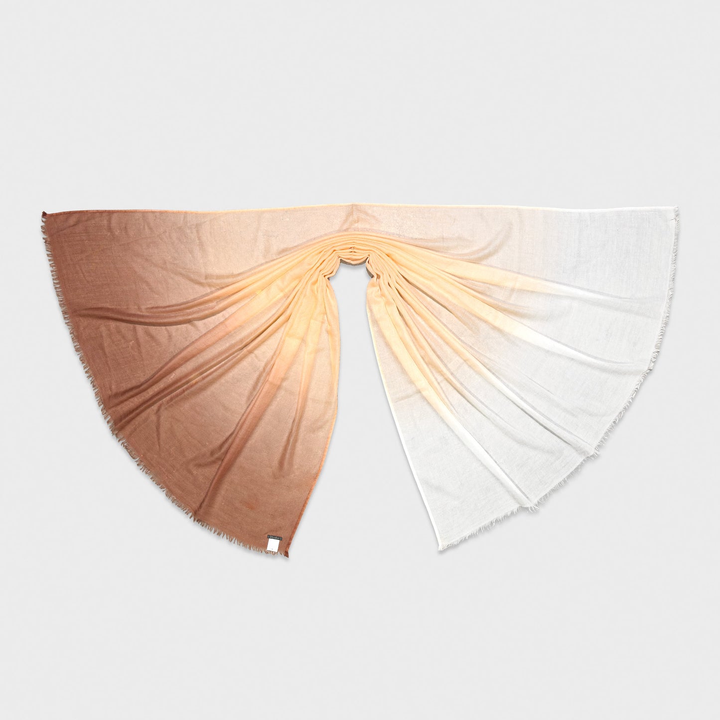 This Faliero Sarti scarf explores colour through a refined gradient transition, blending deep caramel into warm beige before fading into soft ivory.