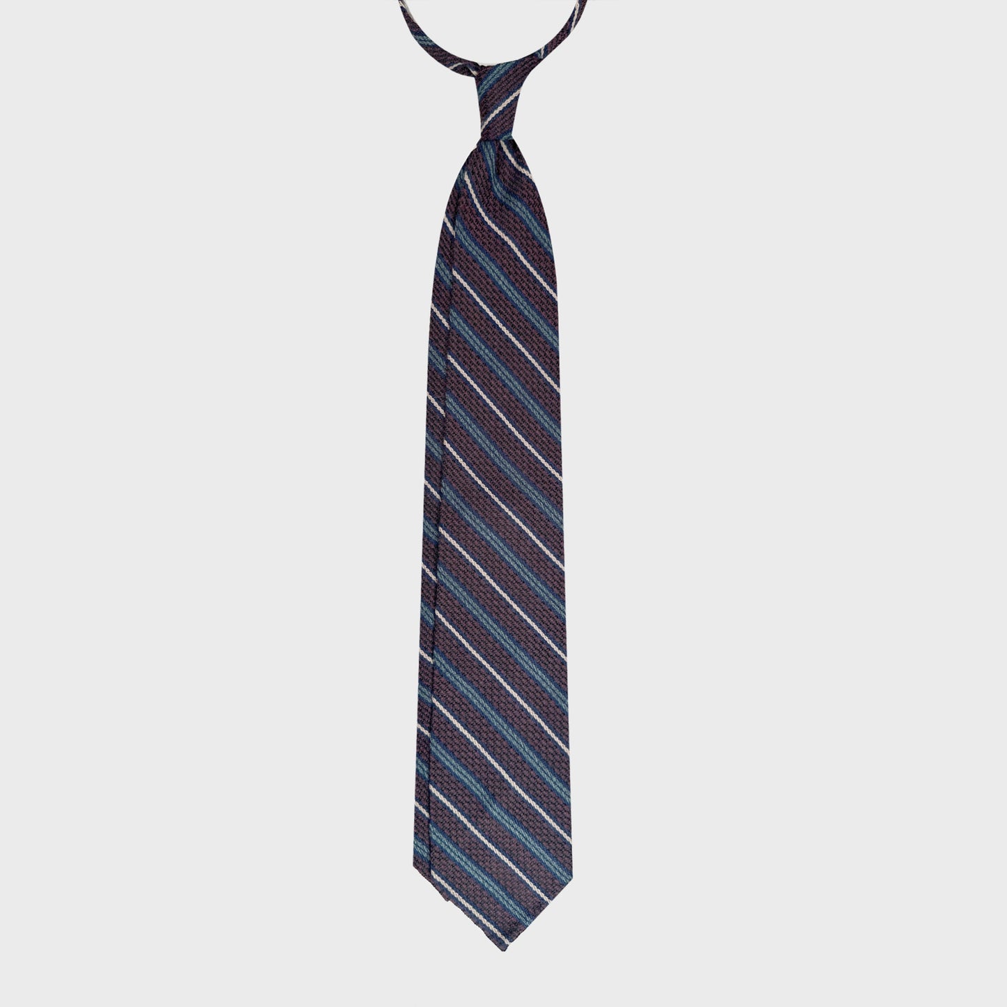 This F.Marino handmade grenadine silk tie features an elegant regimental stripe pattern built on a rich burgundy wine base, enhanced by refined diagonal accents in teal green, navy blue and ivory. The sophisticated palette creates depth and visual rhythm while maintaining a balanced and refined aesthetic suitable for professional environments.