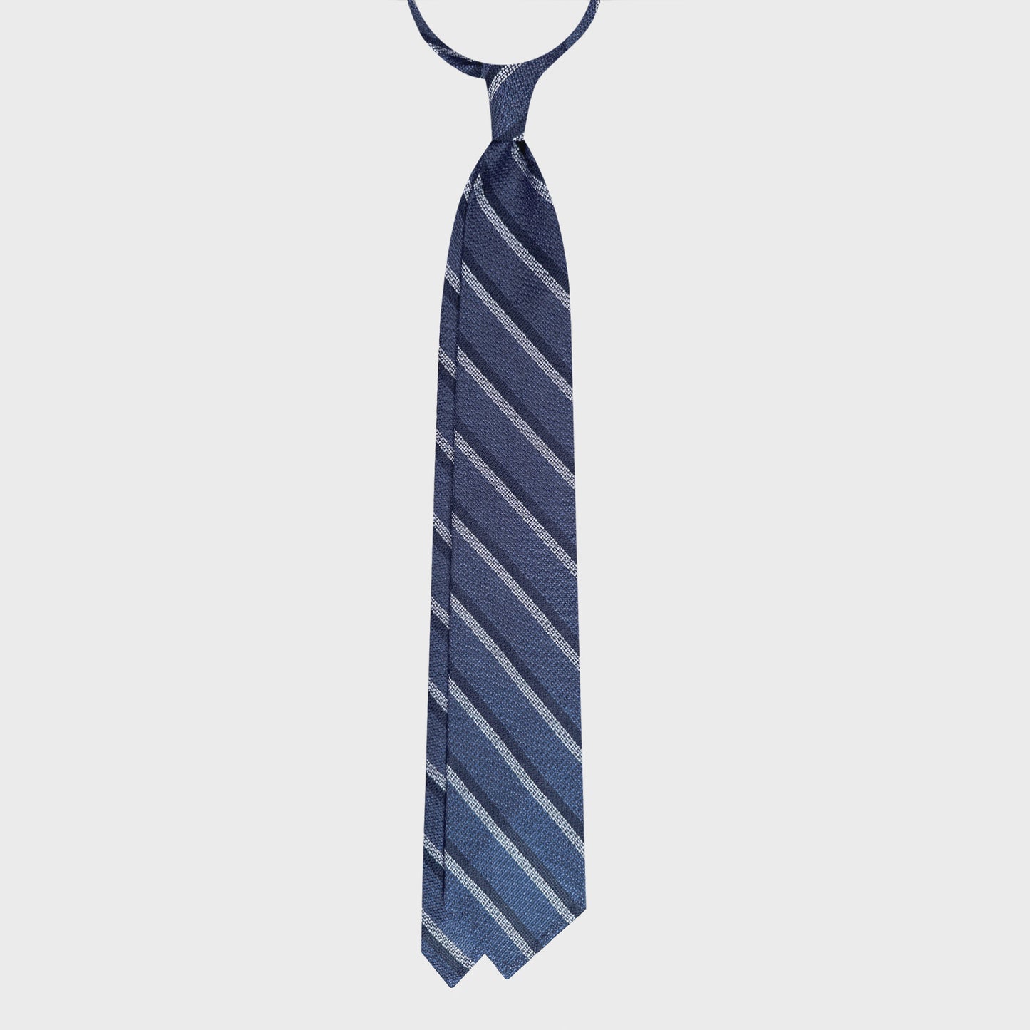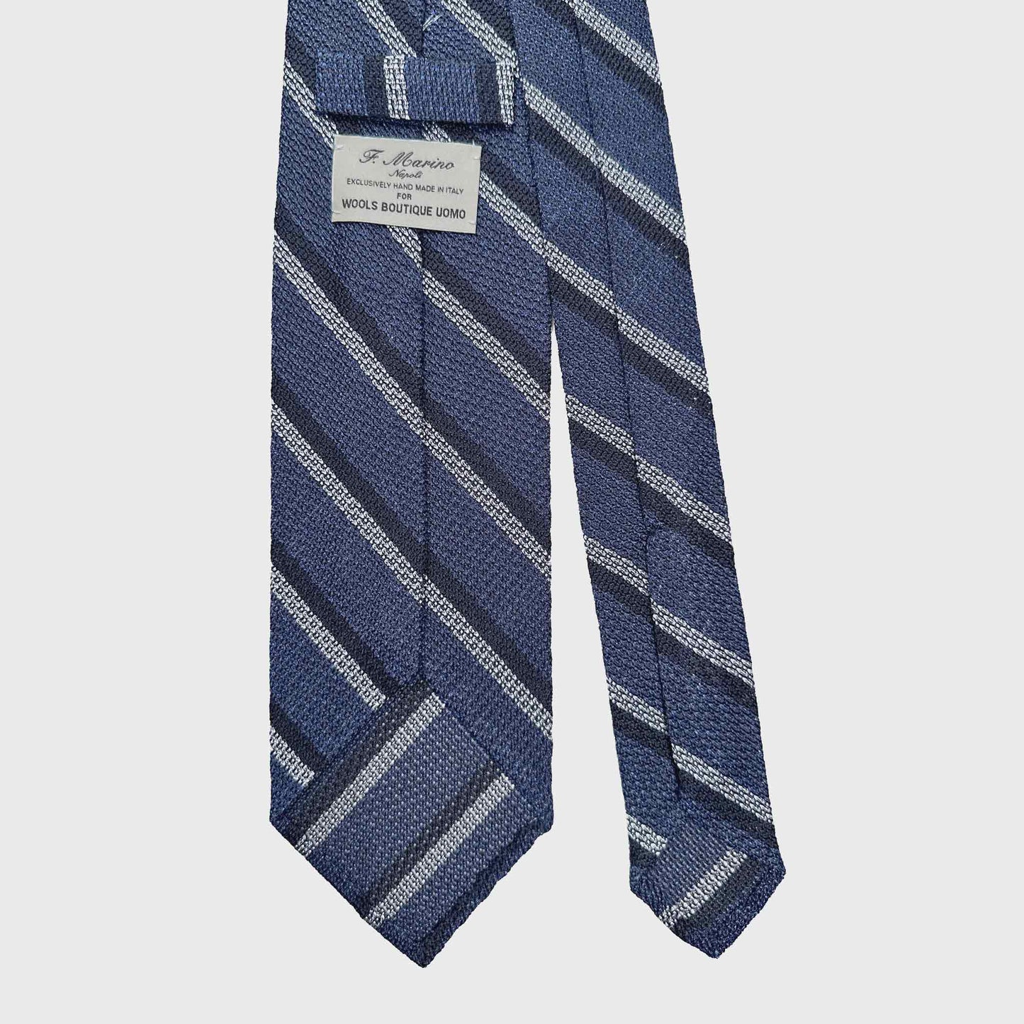 This F.Marino handmade grenadine silk tie features a refined regimental stripe pattern built on a soft denim blue base with navy and silver diagonal stripes. The balanced palette gives the tie a classic yet contemporary character, making it particularly suitable for formal business attire.