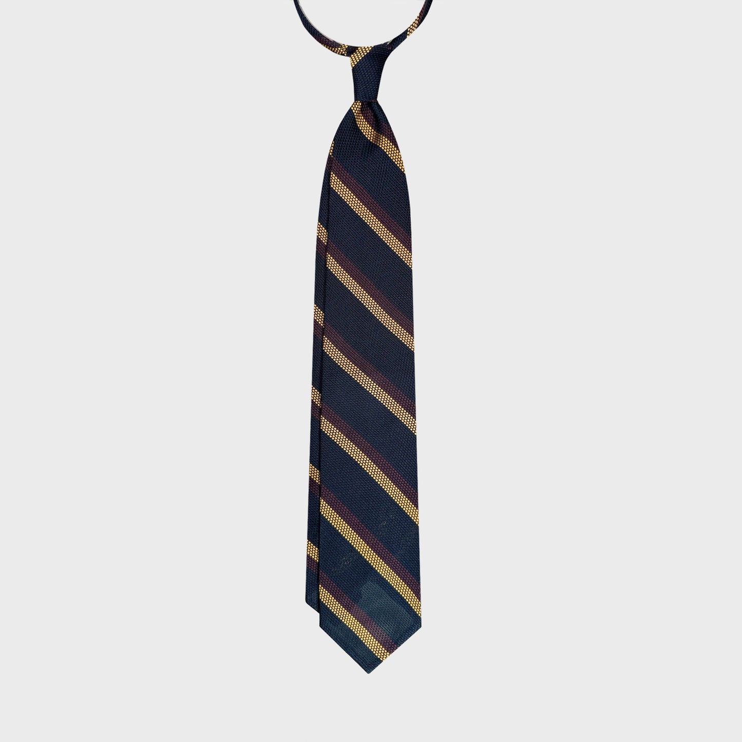 This F.Marino handmade grenadine silk tie features a classic regimental stripe pattern inspired by traditional British club ties. The deep dark navy base is enriched by textured diagonal stripes in gold and burgundy, creating a refined balance between elegance and character.