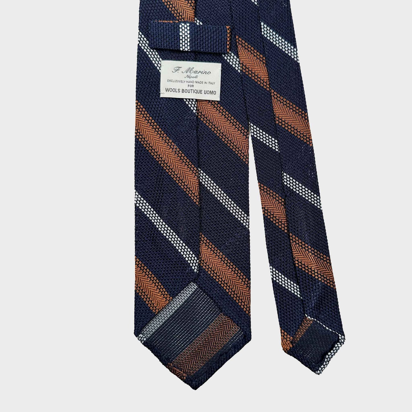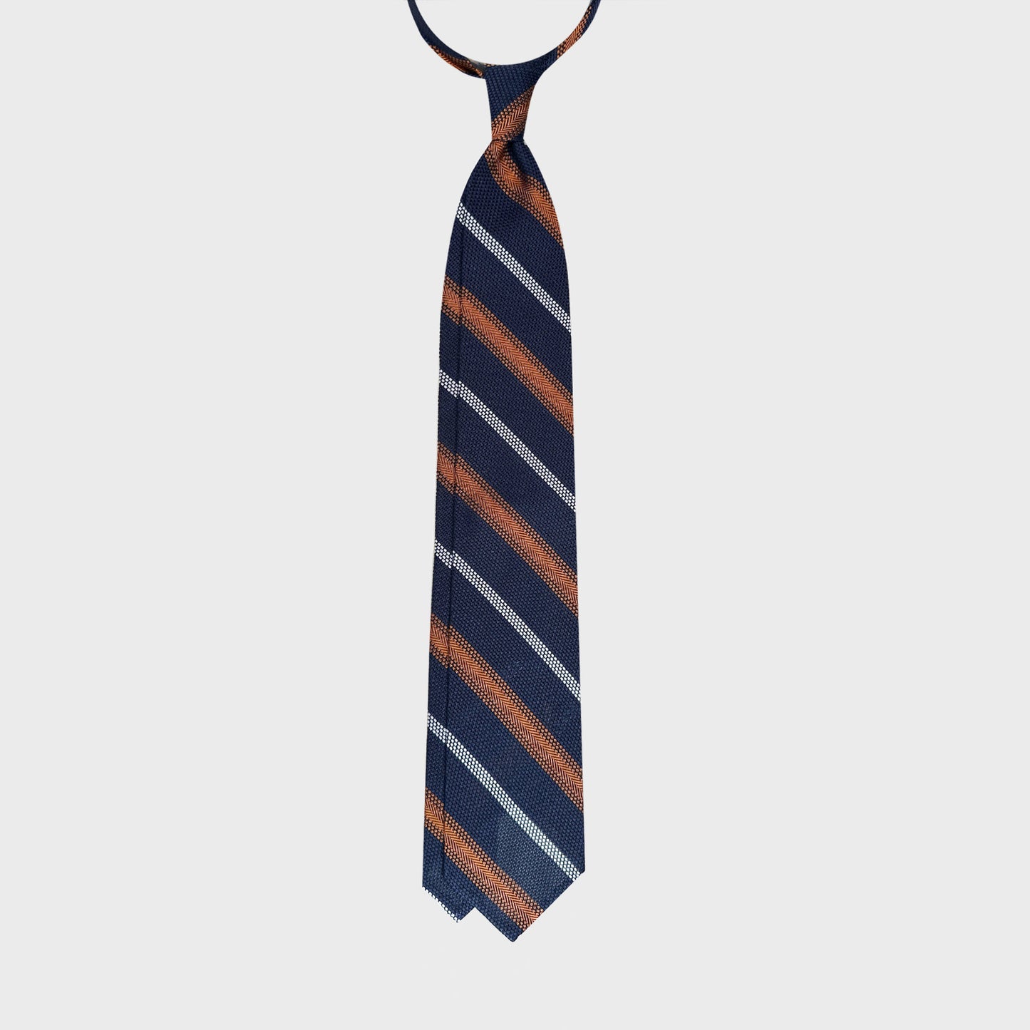 This F.Marino handmade grenadine silk tie features a bold regimental stripe design with refined textural detail. The deep dark navy base is contrasted by distinctive diagonal stripes in warm orange with a subtle herringbone pattern, alongside fine silver accents that add brightness and rhythm to the composition.