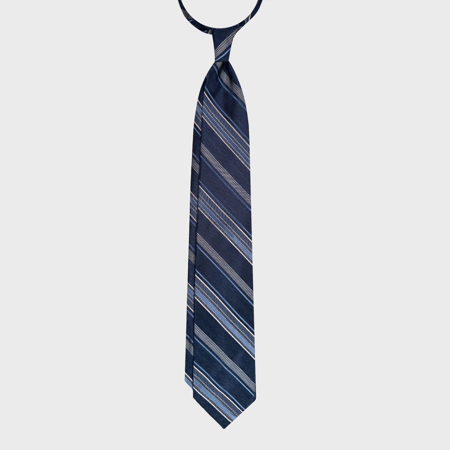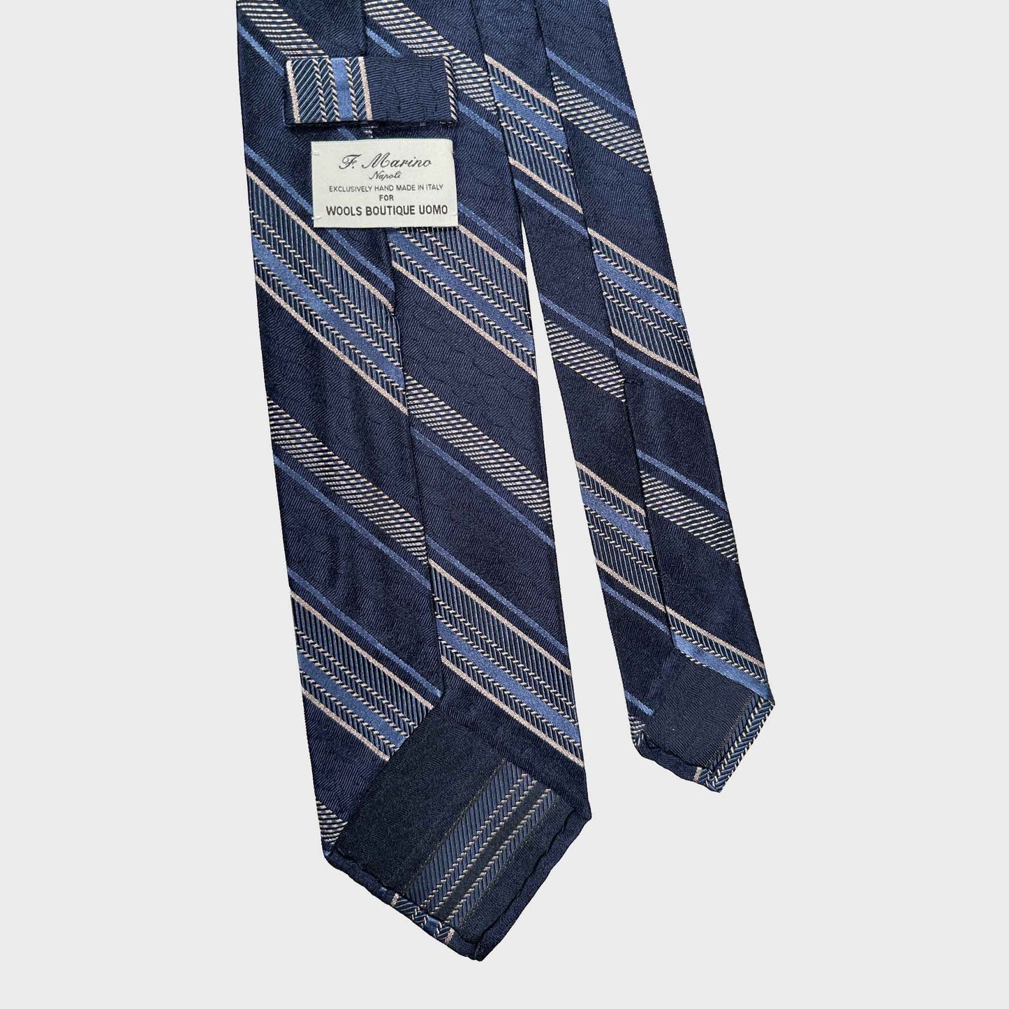 A timeless expression of professional elegance, this F.Marino regimental tie combines classic design with refined Italian craftsmanship. The deep navy blue silk base is enriched by sophisticated sky blue and silver grey stripes, creating a balanced and understated palette perfectly suited to formal business attire. Designed and developed by Wools Boutique Uomo in Geneva, this tie reflects a precise sartorial vision where colour harmony, stripe proportion and fabric selection are carefully curated. It is then handmade in Italy, translating this design into a refined handcrafted product.