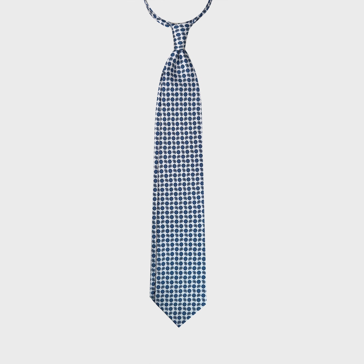 white background with blue paisley and diamonds micro pattern