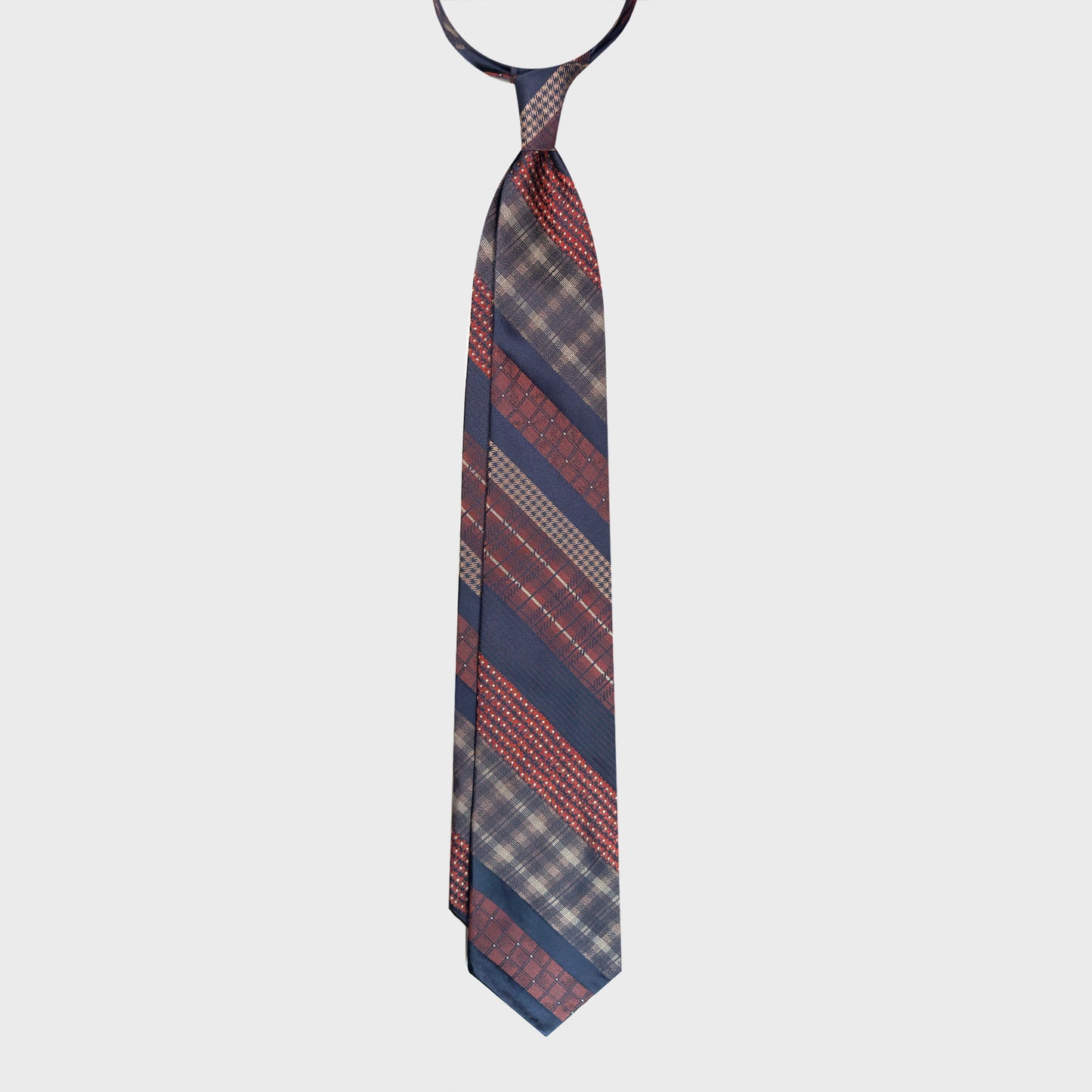 printed patchwork pattern; antique gold checks with navy blue stripe and burgundy micro floral details