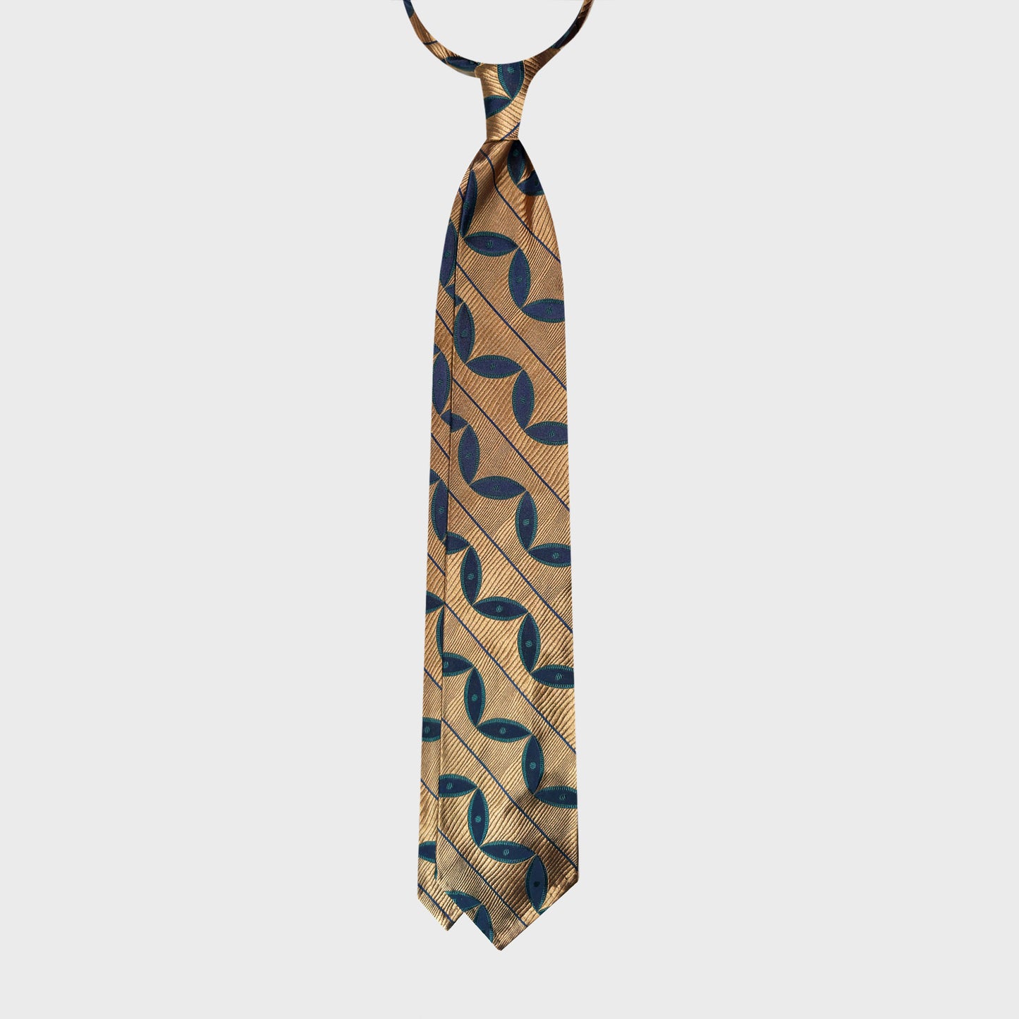 yellow gold background with diagonal stripes and stylised leaves pattern in navy blue and grass green tones, featuring a refined satin texture with luminous depth