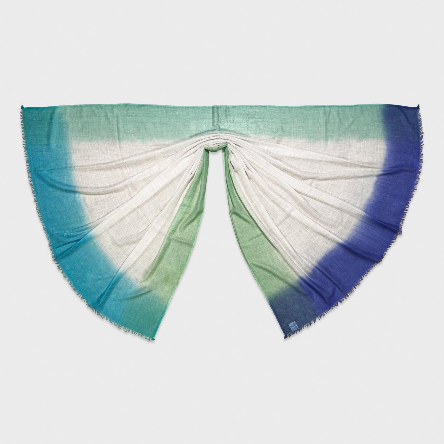 Rich shades of teal green, cobalt blue and lime form the outer edges, giving the scarf depth and character while maintaining an elegant and minimalist aesthetic.