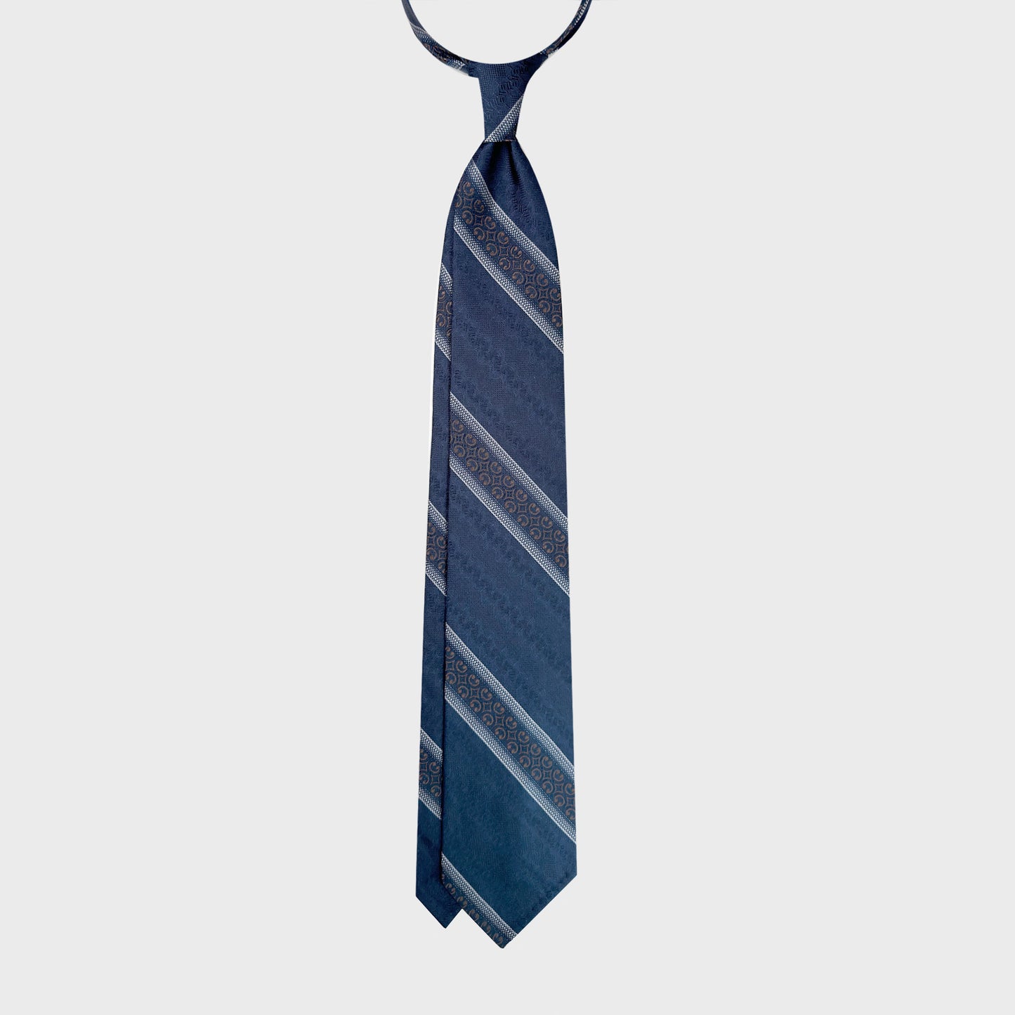 dark denim blue background, white striped, bronze and blue ornamental embroidered